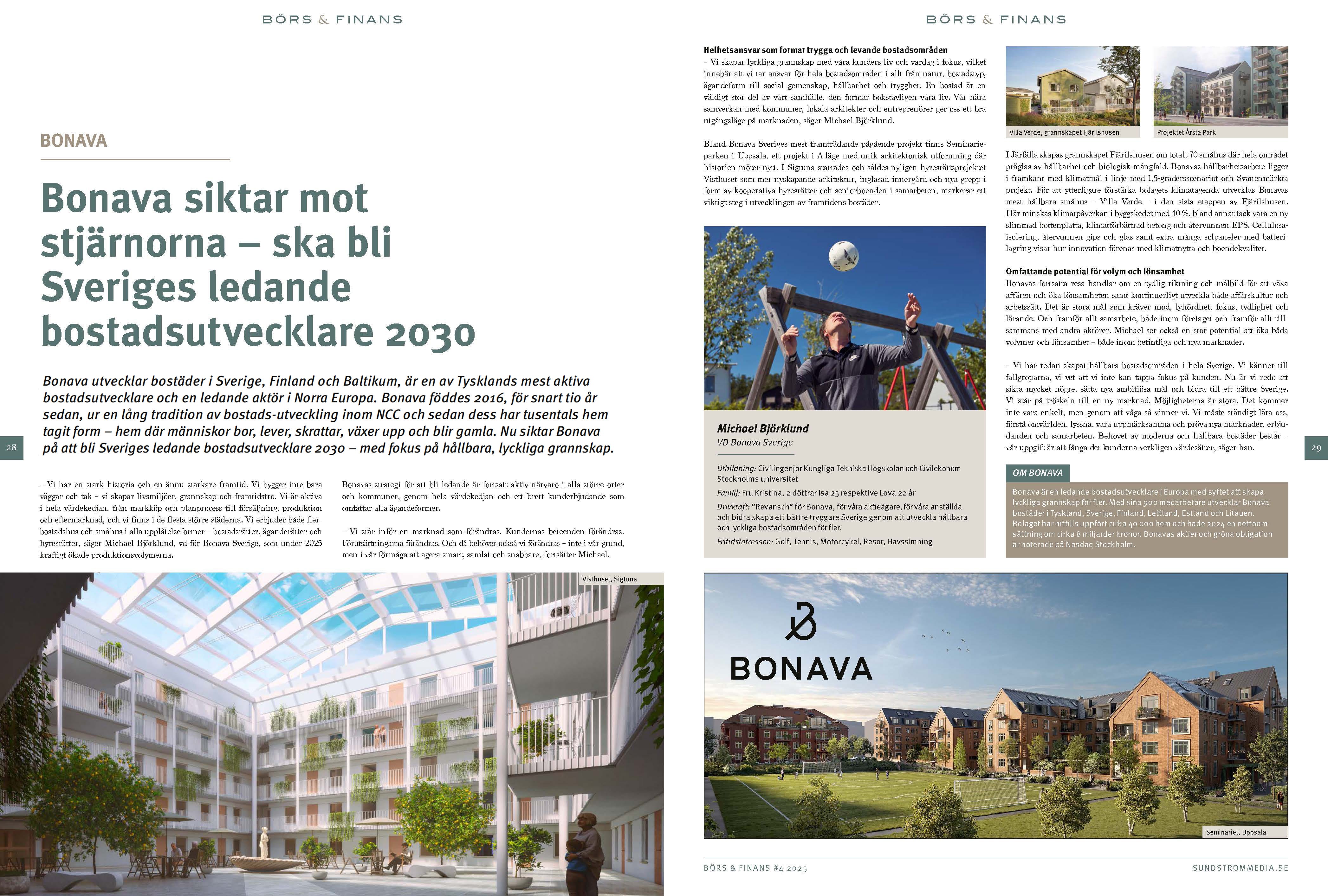 – Vi har en stark historia och en ännu starkare framtid. Vi bygger inte bara väggar och tak – vi skapar livsmiljöer, grannskap och framtidstro. Vi är aktiva i hela värdekedjan, från markköp och planprocess till försäljning, produktion och eftermarknad, och vi finns i de flesta större städerna. Vi erbjuder både flerbostadshus och småhus i alla upplåtelseformer – bostadsrätter, äganderätter och hyresrätter, säger Michael Björklund, vd för Bonava Sverige, som under 2025 kraftigt ökade produktionsvolymerna.